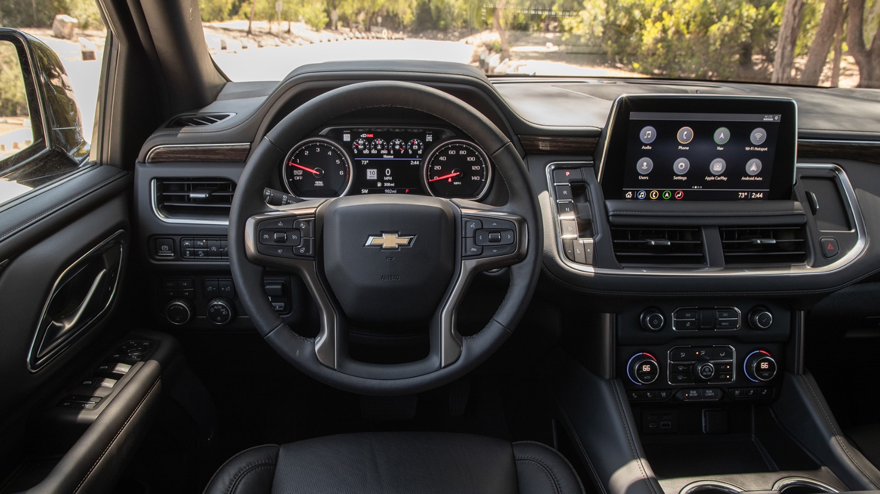 Inside, the Suburban feels like a luxury lounge with a cabin that’s as practical as it is premium. The redesigned dashboard now houses a curved 17.7-inch OLED infotainment display and an 11-inch fully digital instrument cluster. Materials vary by trim but include soft-touch panels, perforated leather seating, woodgrain accents, and aluminum trim. New seating configurations offer increased legroom in the second and third rows thanks to the revised floor plan. Available features now include ventilated second-row captain’s chairs, power-folding third-row seats, tri-zone climate control, and a panoramic sunroof that stretches nearly the full length of the cabin.